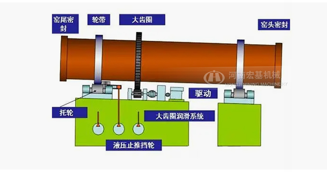 回轉(zhuǎn)窯由筒體,傳動(dòng)裝置,托、擋輪支撐裝置,窯尾密封,外夾套,燃燒系統(tǒng),熱風(fēng)管道系統(tǒng),窯頭罩等部分組成。窯筒體是受熱的回轉(zhuǎn)部件,采用優(yōu)質(zhì)碳素鋼板卷焊制成,筒體通過輪帶支撐在支撐裝置上,并在其中一擋或幾擋支撐裝置上設(shè)有機(jī)械或液壓擋輪,以控制筒體的軸向竄動(dòng);傳動(dòng)裝置通過設(shè)在筒體中部的齒圈使筒體按工藝要求的轉(zhuǎn)速回轉(zhuǎn);由于安裝和維修的需要,較大的窯設(shè)有使窯體以很低轉(zhuǎn)速回轉(zhuǎn)的輔助傳動(dòng)裝置;為防止冷空氣進(jìn)入和煙氣粉塵溢出筒體,在筒體的進(jìn)料端和出料端設(shè)有可靠的窯尾和窯頭密封裝置。為保證外加熱效率,夾套內(nèi)設(shè)置特殊風(fēng)道,保證熱風(fēng)的熱效率和精準(zhǔn)控溫。筒體外壁和內(nèi)壁設(shè)置專用的防粘壁裝置,保證物料的順暢性。