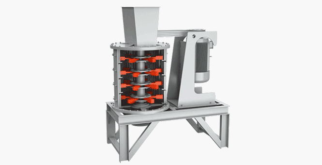 物料由機器上部垂直落入高速旋轉(zhuǎn)的葉輪內(nèi),在高速離心力的作用下,與另一部分以傘狀形式分流在葉輪四周的物料產(chǎn)生高速撞擊與粉碎,物料在互相撞擊后,又會在葉輪和機殼之間以物料形成渦流多次的互相撞擊、摩擦而粉碎,從下部直通排出,形成閉路多次循環(huán),由篩分設(shè)備控制達到所要求的成品粒度。