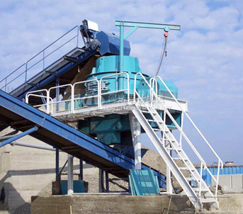 物料由機(jī)器上部垂直落入高速旋轉(zhuǎn)的葉輪內(nèi),在高速離心力的作用下,與另一部分以傘狀形式分流在葉輪四周的物料產(chǎn)生高速撞擊與粉碎,物料在互相撞擊后,又會(huì)在葉輪和機(jī)殼之間以物料形成渦流多次的互相撞擊、摩擦而粉碎,從下部直通排出,形成閉路多次循環(huán),由篩分設(shè)備控制達(dá)到所要求的成品粒度。